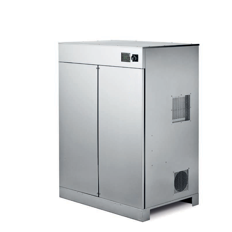 Le déshumidificateur par absorption GECO C65E-11,1 de fabrication danoise est conçu avec une carrosserie en acier inoxydable. Sa conception design permet d'installer l'unité directement dans le local à déshumififier.