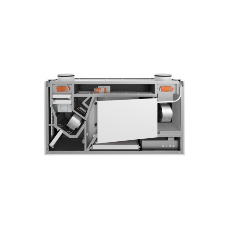La ventilation double flux est assurée grâce à des ventilateurs EC (à basse consommation) ainsi qu’un échangeur de chaleur en aluminium à haute efficacité. Ainsi en hiver, la température de l’air insufflé augmente alors qu’en été la température est diminuée.